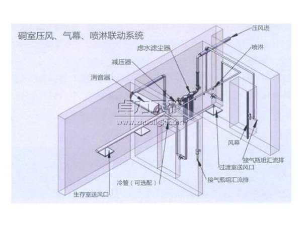 氣幕噴淋系統(tǒng)主要解決外界有毒有害氣體進(jìn)入硐室和過渡室換氣問題。氣幕吹洗是在第一道門內(nèi)側(cè),使壓縮空氣通過氣幕管形成致密的氣簾,阻擋外界空氣的進(jìn)入,同時掃除外界進(jìn)入人員身上攜帶的有毒有害物質(zhì)。噴淋則是通過注入大氣量的新鮮壓縮空氣,將有害氣體稀釋并通過泄壓閥排放到室外,以達(dá)到降低有害氣體濃度并凈化的目的。
