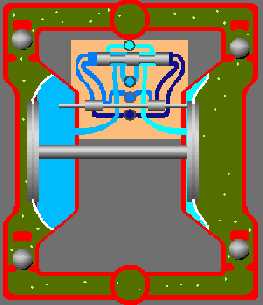 在泵的兩個對稱工作腔中,各裝有一塊有彈性的隔膜6,聯(lián)桿將兩塊隔膜結成一體,壓縮空氣從泵的進氣接頭1進入配氣閥3后,推動兩個工作腔內(nèi)的隔膜,驅使聯(lián)桿聯(lián)接的兩塊隔膜同步運動。與此同時,另一工作腔中的氣體則從隔膜的背后排出泵外。一旦到達行程終點。配氣機構則自動地將壓縮空氣引入另一個工作腔,推動隔膜朝相反方向運動,這樣就形成了兩個隔膜的同步往復運動。每個工作腔中設置有兩個單向球閥4,隔膜的往復運動,造成工作腔內(nèi)容積的改變,迫使兩個單向球閥交替地開啟和關閉,從而將液體連續(xù)地吸入和排出。
