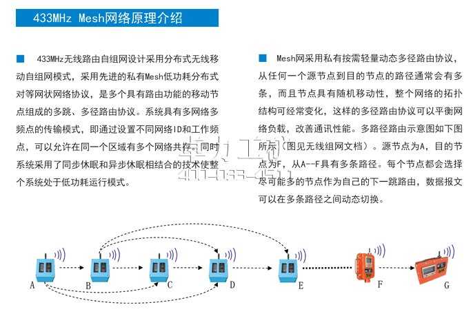 ■ 該系統(tǒng)采用國內(nèi)首創(chuàng)的“433M無線路由自組網(wǎng)模式”。各傳感器節(jié)點采用的是一種完全分布式、對等的無線自組網(wǎng);