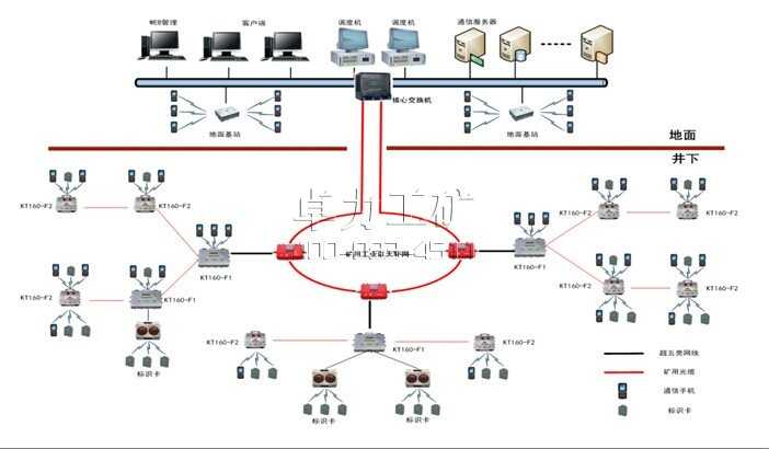 KT160礦用無(wú)線通信系統(tǒng)(以下簡(jiǎn)稱“KT160系統(tǒng)”),是適用于對(duì)煤礦井下和井上的手機(jī)進(jìn)行監(jiān)控與管理的綜合性系統(tǒng)。該系統(tǒng)通過(guò)光纖及網(wǎng)絡(luò)交換機(jī)完成地面服務(wù)器與井下設(shè)備的數(shù)據(jù)交換,通過(guò)快速的數(shù)據(jù)傳輸實(shí)現(xiàn)將井下或井上的不同基站下的手機(jī)的互聯(lián)互通,即可節(jié)約資源又方便管理,該系統(tǒng)適用于各類大、中、小型礦井。本系統(tǒng)采用統(tǒng)一標(biāo)準(zhǔn)的工業(yè)以太網(wǎng)絡(luò)架構(gòu),為人員位置監(jiān)測(cè)與管理、數(shù)字化視頻監(jiān)控、各種井下傳感器(例如:瓦斯)數(shù)據(jù)的統(tǒng)一采集與綜合處理提供了一個(gè)共用的網(wǎng)絡(luò)平臺(tái),實(shí)現(xiàn)語(yǔ)音、視頻、數(shù)據(jù)的三網(wǎng)合一,為生產(chǎn)調(diào)度、應(yīng)急救援、安全監(jiān)控與督查提供了科學(xué)手段。