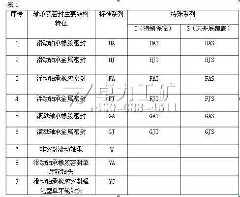 鉆頭系列代號(hào):對(duì)于三牙輪鉆頭,按其軸承及密封結(jié)構(gòu)主要特征,分為9個(gè)標(biāo)準(zhǔn)系列。除軸承和密封外,鉆產(chǎn)學(xué)研結(jié)構(gòu)上比較大的改進(jìn)作為特殊結(jié)構(gòu),標(biāo)準(zhǔn)系列與特殊結(jié)構(gòu)或特殊結(jié)構(gòu)的組合組成特殊系列。對(duì)于單牙輪鉆頭,鉆頭系列代號(hào)以“Y×”表示,“Y”指一個(gè)牙輪,“×”為設(shè)計(jì)編號(hào),代表不同鉆頭設(shè)計(jì)特征,江漢鉆頭系列代號(hào)見(jiàn)下表1.