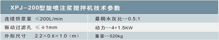 XPJ-200型旋噴注漿攪拌機(jī)由水泥過(guò)篩,漿液過(guò)濾,紊流攪拌系統(tǒng)組成的高速水泥攪拌機(jī)主要特點(diǎn)是連續(xù)供漿,不含顆粒雜物,可保證注漿不發(fā)生堵噴嘴故障,這對(duì)于旋噴注漿施工至關(guān)重要。
