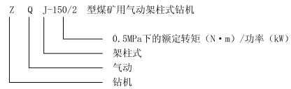 型號示例:ZQJ-150/2 型煤礦用氣動架柱式鉆機:Z 表示鉆機;Q 表示氣動驅動回轉器;J 表示架柱式;150/2 表示在 0.5MPa 氣壓下的額定轉矩為 150N·m,此時回轉器功率為 2kW。